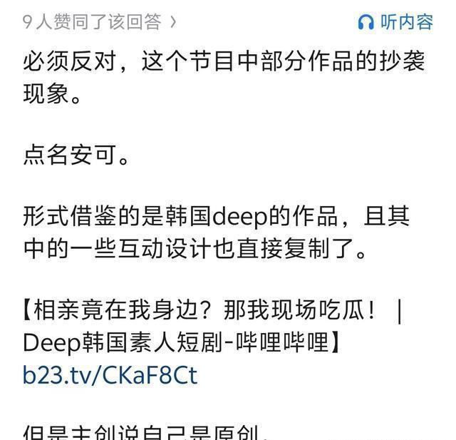 网友指出《安可》的创意和结构与一部韩国deep短剧高度相似,不同的是把男女主角的相遇地点从咖啡店改成了大张伟的演唱会,并指出这个改编没有原作品合理,同时还贴出了原作的视频切片链接。